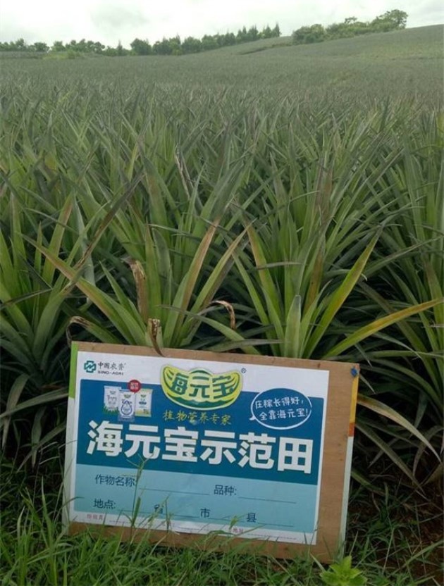 廣東省徐聞縣位于我國大陸的最南端,素來有"菠蘿之鄉(xiāng)""菠蘿的海"的美譽(yù)。當(dāng)?shù)夭ぬ}種植面積達(dá)20多萬畝,但由于連年耕種,土地重茬酸化嚴(yán)重,菠蘿種植日趨黃化,并且有逐漸加重現(xiàn)象。當(dāng)?shù)赜修r(nóng)戶在使用海元寶復(fù)合肥以后,黃化狀況大為改觀。