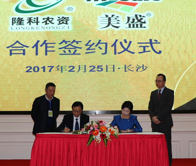 ?????湖南隆科總經理米導武在開場致辭中表示,該公司成立于2004年,歷經13年的成長,如今在湖南市場占有率上穩居同行業之首,成為湖南省的農業產業化龍頭企業。此次與美盛結盟,勢必將美盛產品打造成為湖南農業豐收不可或缺的肥料資源。??? 米導武還表示,湖南隆科立志要把農資連鎖渠道建設好、把服務營銷做到極致。湖南隆科愿意與所有的合作伙伴共同構建和諧、有序的市場經營環境,攜手并肩、實現共贏。??? “湖南隆科5000多個銷售網點,18家縣級農資配送中心,改建擴建2788個自建網點,以及年銷肥料100多萬噸是美盛產品深耕湖南的有力保障。”湖南隆科副總經理黃秋林信心滿滿地說。??? 發布會上,中農集團控股股份有限公司總經理助理蔡占江在發言中表示,湖南隆科是中農控股旗下肥料生產和流通企業,也是湖南最大的流通商,美國美盛公司是世界一流的化肥生產貿易商,兩家公司攜手推廣美盛的優質產品,將極大地促進中國農業的發展。 ????????