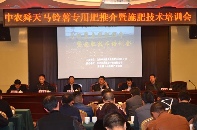 ? ? 日前,中農舜天生態肥業有限公司(下簡中農舜天)馬鈴薯專用肥推介會暨施肥技術培訓會在河北張家口市張北縣隆重召開。中農舜天組織銷售及農化團隊參加會議,張北縣以及周邊的種植大戶120人參加會議。