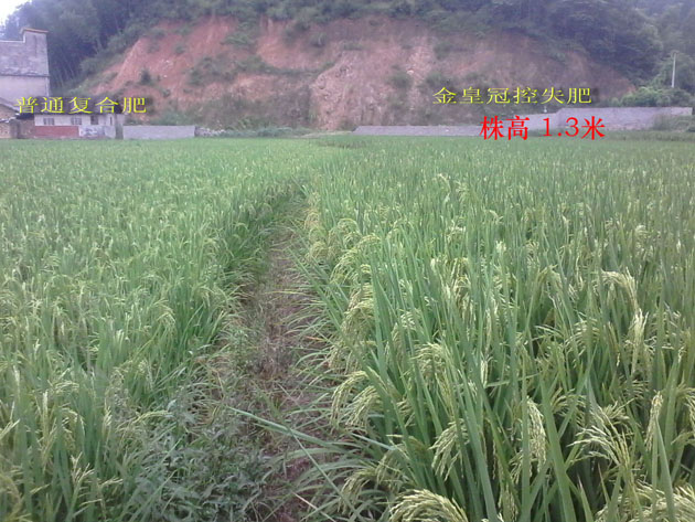 ? ? 在示范田現場,施用金皇冠控失肥與施用普通肥料的水稻差異明顯,只見施用金皇冠控失肥的水稻長勢良好,整片稻田植株達到1.3米左右,稻穗更為結實飽滿。“種好還要肥料好。種了40多年田,也沒看到這么好的稻子,每畝增產50-75公斤?!币晃徽趧谧鞯淖T姓老農笑得合不攏嘴:“根長莖粗不倒伏,病蟲害也少了,感謝你們研制出這么好的肥料”。據這位老農介紹,示范田今年種植的是廣兩優1128,每畝施用金皇冠控失肥25公斤,用10公斤尿素作追肥,粗略估計今年畝產將達800公斤左右。