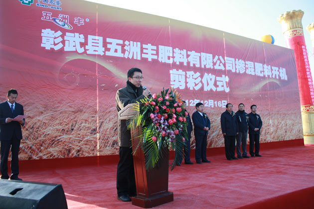 ?? ? 近日,彰武縣五洲豐肥料有限公司(下稱“彰武五洲豐”)竣工投產儀式在廠區內隆重舉行。遼寧省阜新市副市長馬如軍,阜新市彰武縣縣長劉玉學,副縣長常東旭等地方政府領導,以及公司總經理羅德強、公司實業管理部經理陳永濤,五洲豐農業科技有限公司(下稱“五洲豐”)總經理王學江出席儀式,來自遼寧省阜新市的各地區優秀經銷商和各媒體代表共200余人參加儀式。? ? ? ? ?彰武五洲豐為五洲豐于2012年在遼寧省阜新市彰武縣設立的全資子公司。2012年4月,彰武縣五洲豐正式啟動建設年設計生產能力100萬噸的大型化肥生產基地項目,項目計劃總投資1.86億元,占地面積220畝,現已完成3條自動生產線的投資建設,并順利投入運營。? ? ? ? ?作為彰武縣重點扶持項目,彰武五洲豐化肥生產基地的正式投產不僅標志著五洲豐區域性的物流、營銷、生產建設取得了實質成效,同時對區域農資產業和縣域經濟的發展也具有巨大的推動作用。