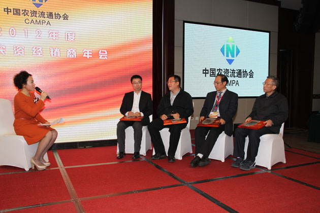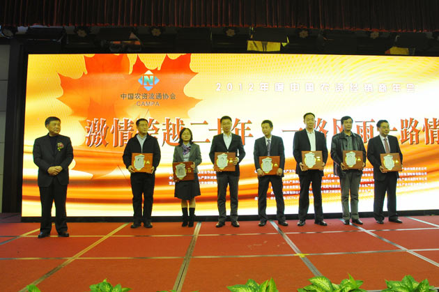? ??11月18日,中國農業生產資料流通協會“2012年中國農資經銷商年會”在北京召開。來自國家發展和改革委員會、科技部、工業和信息化部、財政部、農業部、商務部、國家工商行政管理總局、中國科學院、中國物聯網發展研究中心、中國石油和化學工業聯合會、中國商業聯合會、中國市場學會、人民日報社、中央電視臺農業頻道、光明日報社、農民日報社、中華合作時報社以及供銷總社下屬13家社團組織等單位的嘉賓和全國各地的會議代表約400余人參加了此次會議。總社理事會副主任、中國農業生產資料流通協會會長、中國供銷集團董事長顧國新出席大會并致辭。中農集團董事長、黨委書記肖仲凱,集團黨委副書記李憲賓,集團董事、中農控股總經理羅德強等作為受邀嘉賓出席了大會。